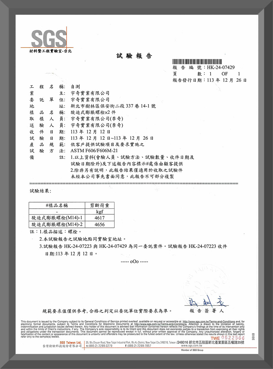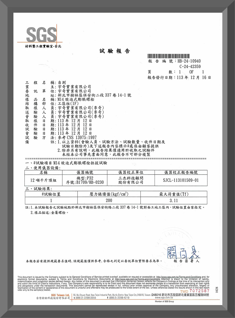 經SGS測試,其抗拉拔力達3.11Tf且尚未被破壞,剪斷力更高達4600Kgf以上!